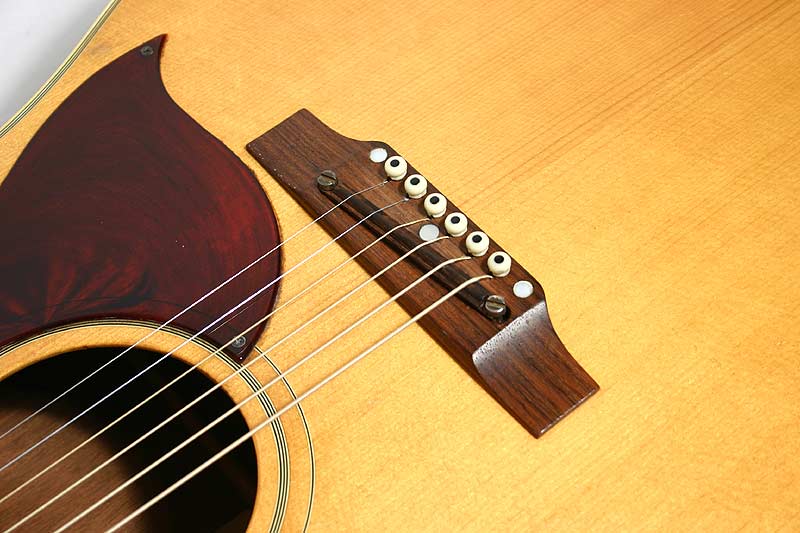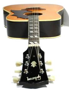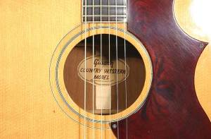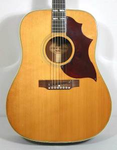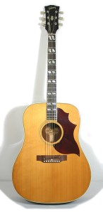 Here’s a 1965 Gibson flattop acoustic I restored (serial 512184). It’s a square shoulder Country Western model. This is the same model as played by Sheryl Crow (hers is a ’62). It’s a slight variation of Gibson’s renowned Hummingbird without the garishly ornate scratch plate. The body is similar to Gibson’s J-45 slope shoulder dreadnought design, but with wider, square shoulder accents on the upper bouts. The spruce top projects a full, balanced expression, with blended dark lows and brilliant highs. It good sound for vocal accompaniment.