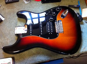 This is a 2011 USA made H/S/S Special. It has a 70s-style headstock and decal but the neck has a modern profile with jumbo frets. This is essentially a Highway One Strat with a poly finish. Customer needed a full setup including fret dress. The guitar had come from the Corona factory with quite a high bridge action. The ut channels had also been slotted in a hurry.