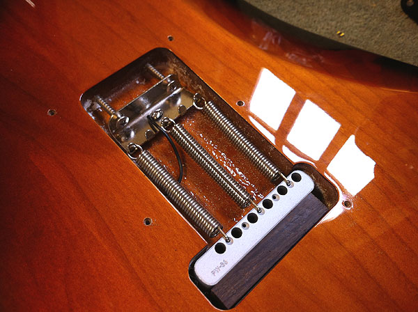 The owner wanted a fixed non-trem bridge. This was accomplished by neutering the bridge with a block of mahogany placed between behind the aluminum block. If you have a Strat and you don’t use the trem this is a great way to fix it in place and add a bit more sustain to your guitar.