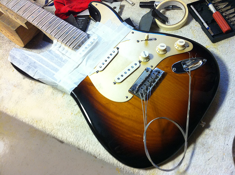 This 2003 Custom Shop Strat has a one piece alder body, Noiseless pickups, one piece maple neck and Sperzel locking machine heads. The owner Sam felt there were some set-up issues with the guitar including some fret buzz around the 9th fret and a harmonic sitar-like sound when playing the unwound strings in the open position. There were was also 10 years of fret wear and grooves that needed dressing.