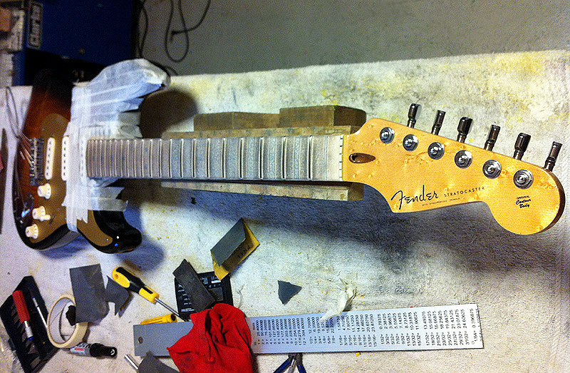 The Fender Custom shop are renowned for their great quality guitars, but they would greatly improve the playability of their models by paying more attention to final set-up process. The nut channels had been incorrectly cut parallel to the strings. A guaranteed way to nail those Ravi Shanker sounds!