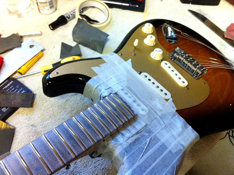 This neck has very pretty birds-eye feathering in the maple. The guitar is finished in nitro-cellulose lacquer. The neck had been finished after the frets had been installed. There was still some of this lacquer covering the edges of some of the frets. This needed scraping before the frets could be dressed.