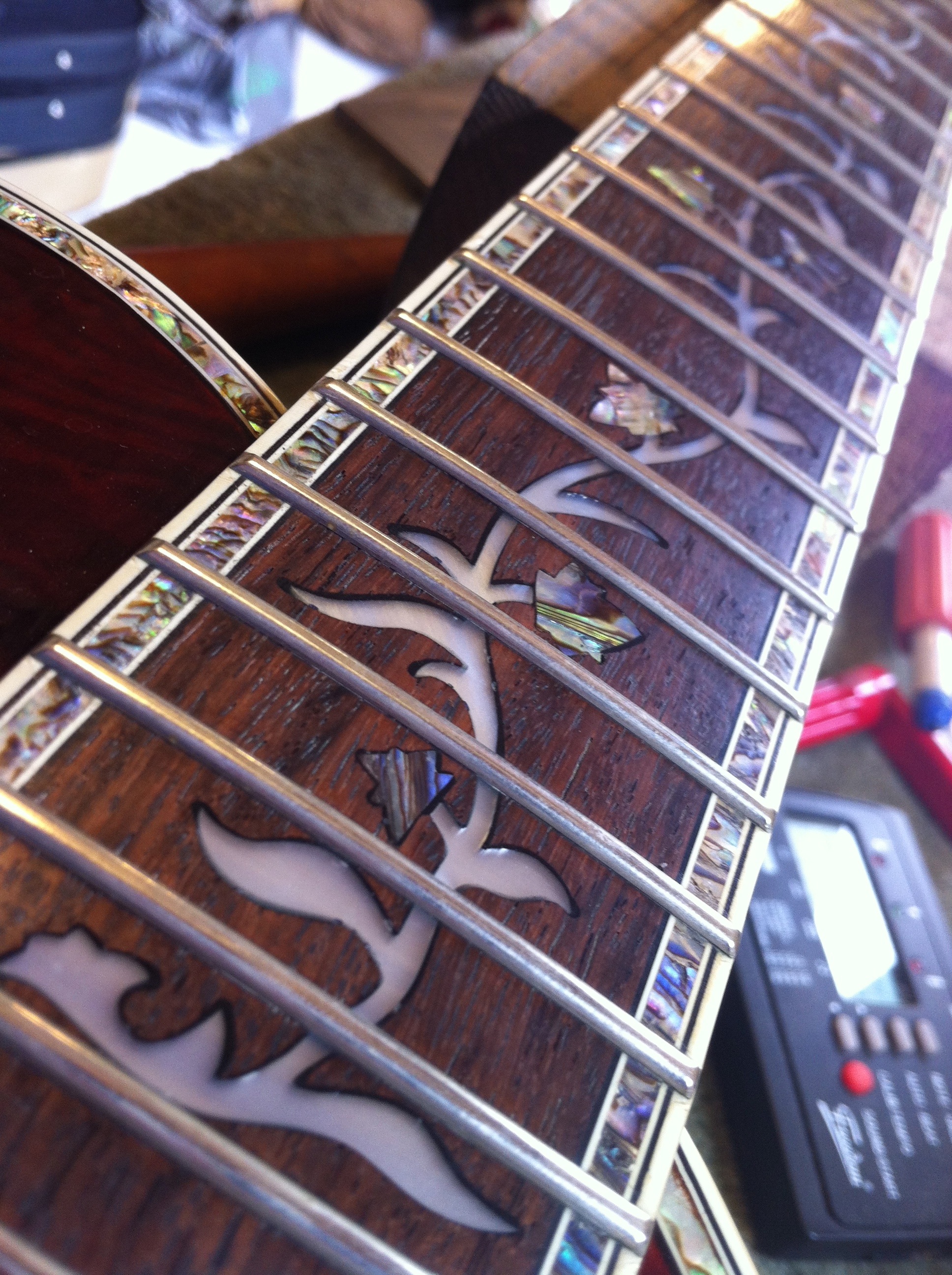 Excessive amounts of MOP (perloid) fingerboard inlay.