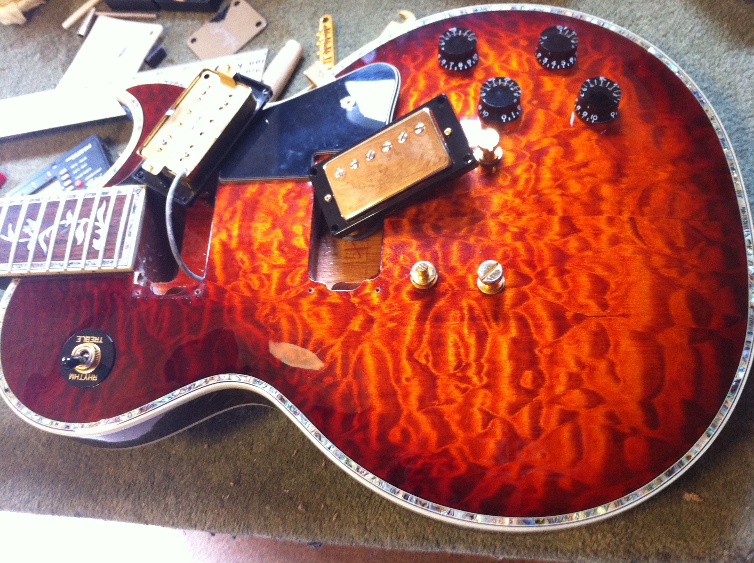 Quilted maple top with shell inlay around the side; sunburst finish; single cutaway body with set-in neck, with Tree Of Life inlay down the fingerboard. Black headstock with shell inlay on the side. This particular guitar has been fitted with 2 Iron Gear ‘Hot Slag’ humbuckers.