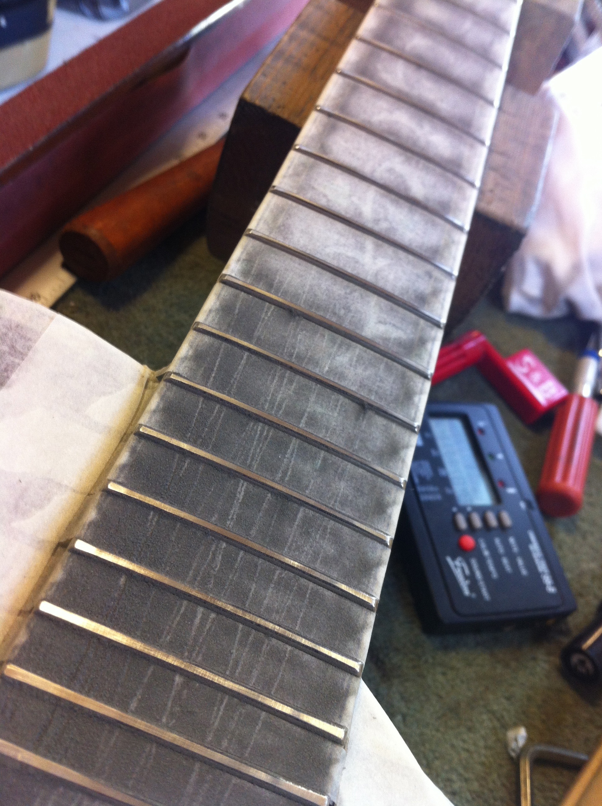 This guitar required a full fret dress to eliminate some fret buzz on the lower frets and to get the action down low. Out of the box the guitar had quite high action, around 4mm at the 12th fret.