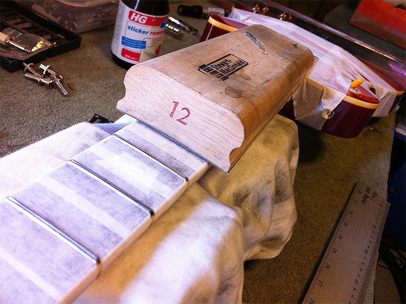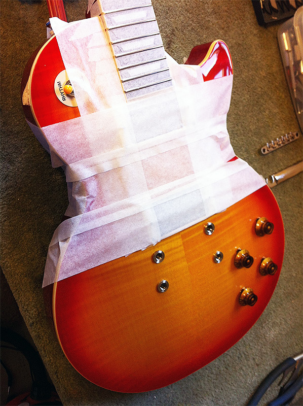 One of the nicest Les Pauls by far I have worked on this year has not been a Gibson, but this 1959 tribute Epiphone Les Paul Standard. Period correct long tenon neck joint, carved hard maple cap with  flame maple veneer, 50s rounded profile with medium jumbo frets, Mallory caps and Gibson Burstbucker pickups.