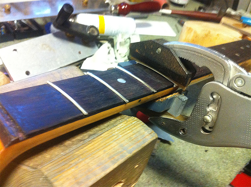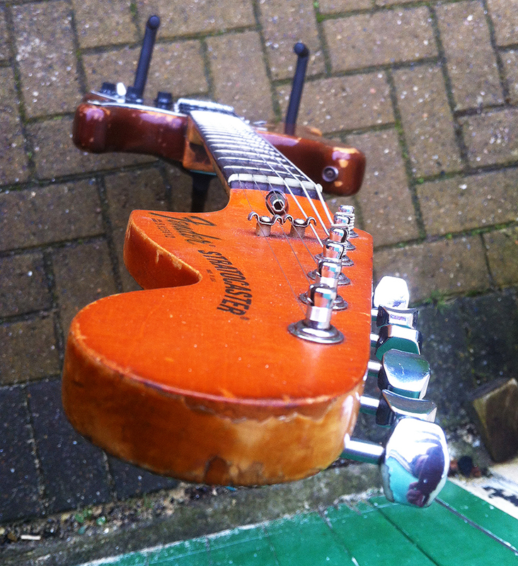 1979 3-bolt Fender Strat. The frets on this guitar had been dressed so low there was no more fret left to play on. Famously Fender hammered these frets in sideways back in the day – but not this one. It seems to have been a custom order with extra wide jumbo frets – probably bass wire.
