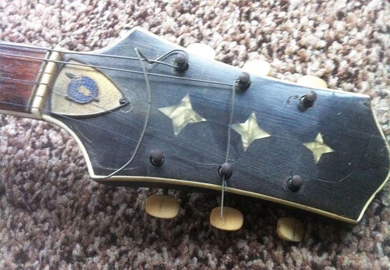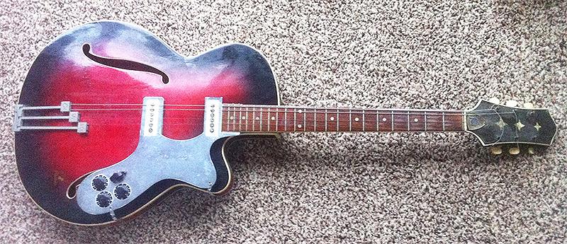 This 1959 Framus came in requiring a replacement bridge and complete overhaul. Seems to be an archtop jazz guitar which as an after thought, the Schaller made electronics housed on a sturdy chrome plate have been bolted onto the top. Very few of these around. Nice honkey tone from the pickups.