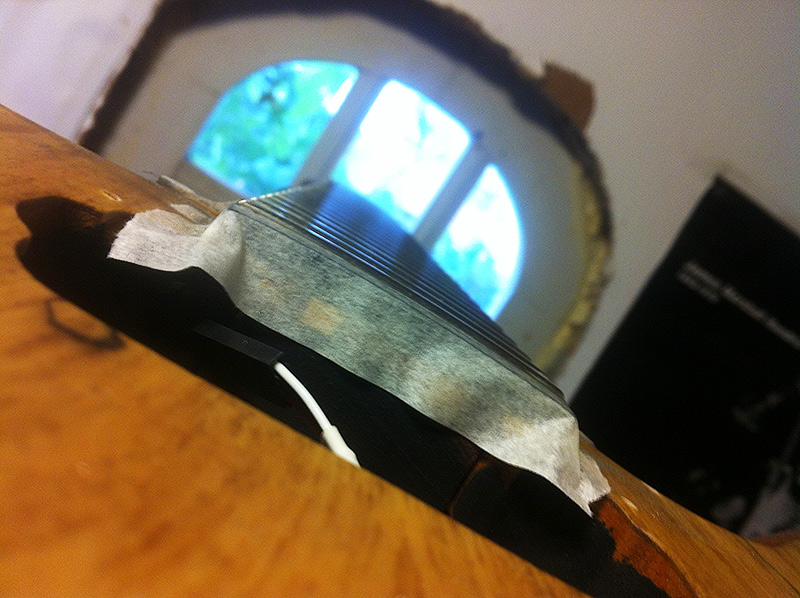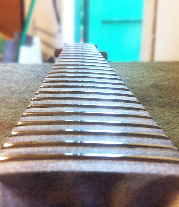 This ESP LTD FX-360SM came in with an undesirable condition in which the ends of the frets protrude from the edges of the fingerboard usually caused by wood shrinkage of the fingerboard. Commonly known as Fret Sprout.