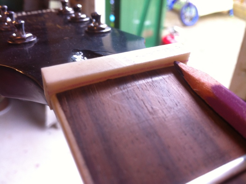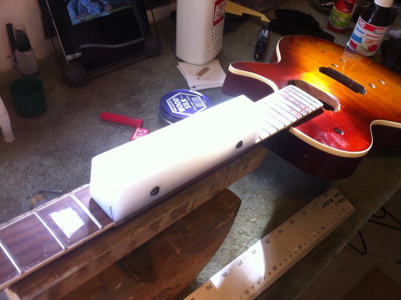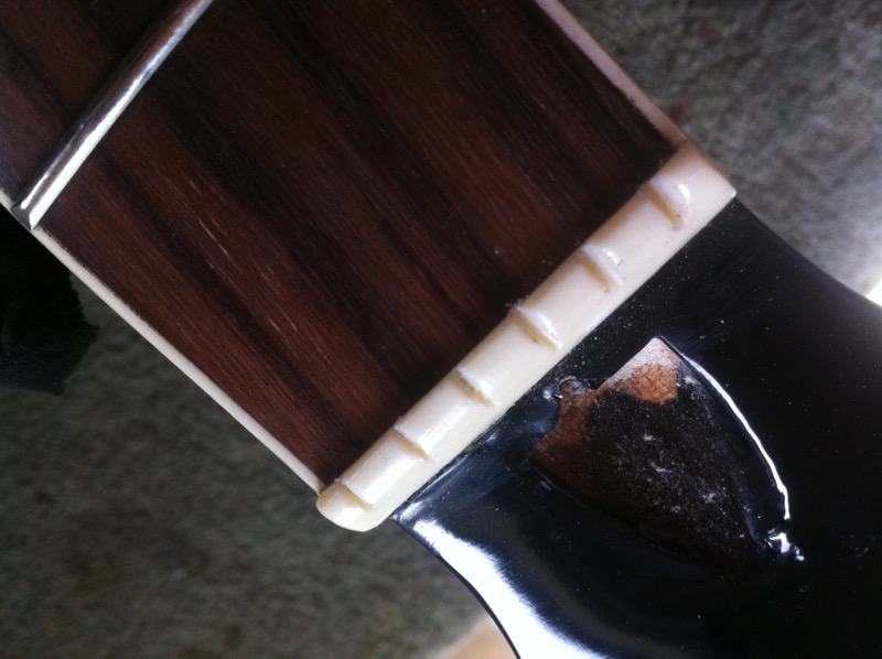 First thing to do with the fretboard is to make sure the frets are fully secured into the rosewood before a fret leveling. Most of these frets let out a dull ‘thonk’ when tapped with a piece of bone suggesting they are loose.