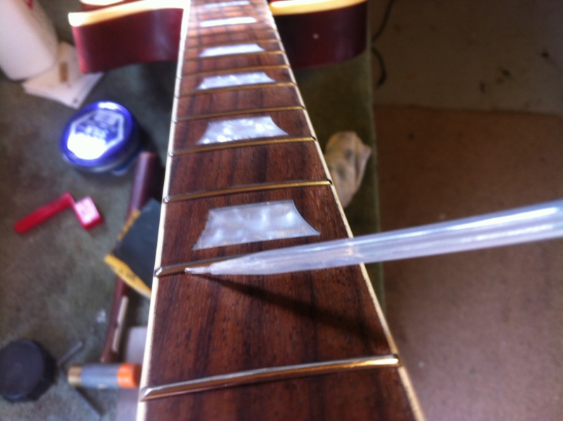 After paste waxing the board, here I use a micro pippet to slide water thin cyanoacrylic glue under the frets – a great way to secure loose frets.