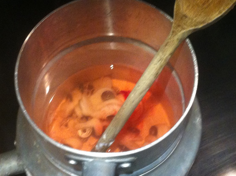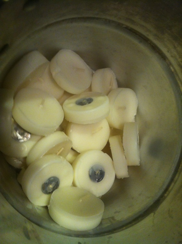 Melting up some paraffin wax – in this case tea lights. Take the stalks out when they’re melted.