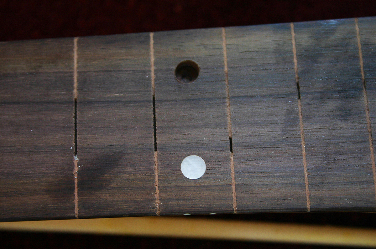 This Strat neck is ready for a full refret, but first we need to fix one of the dot markers on the 12th fret.