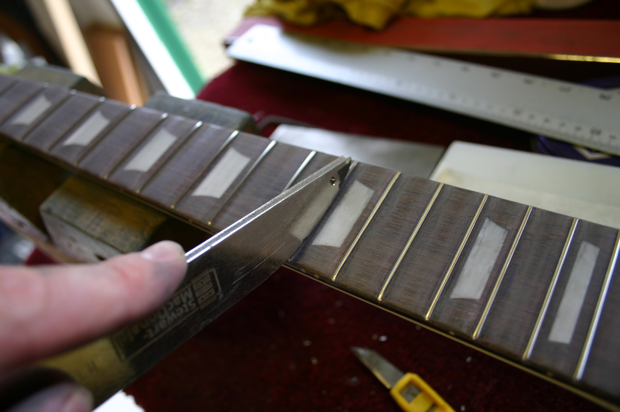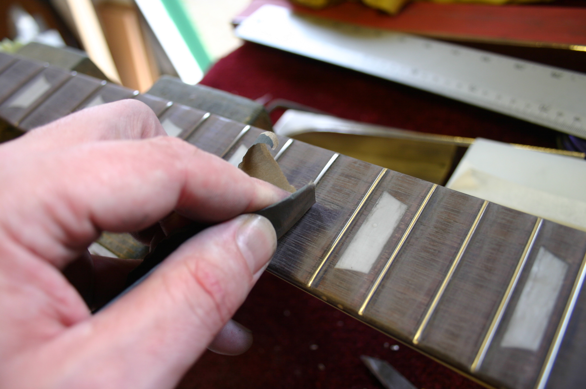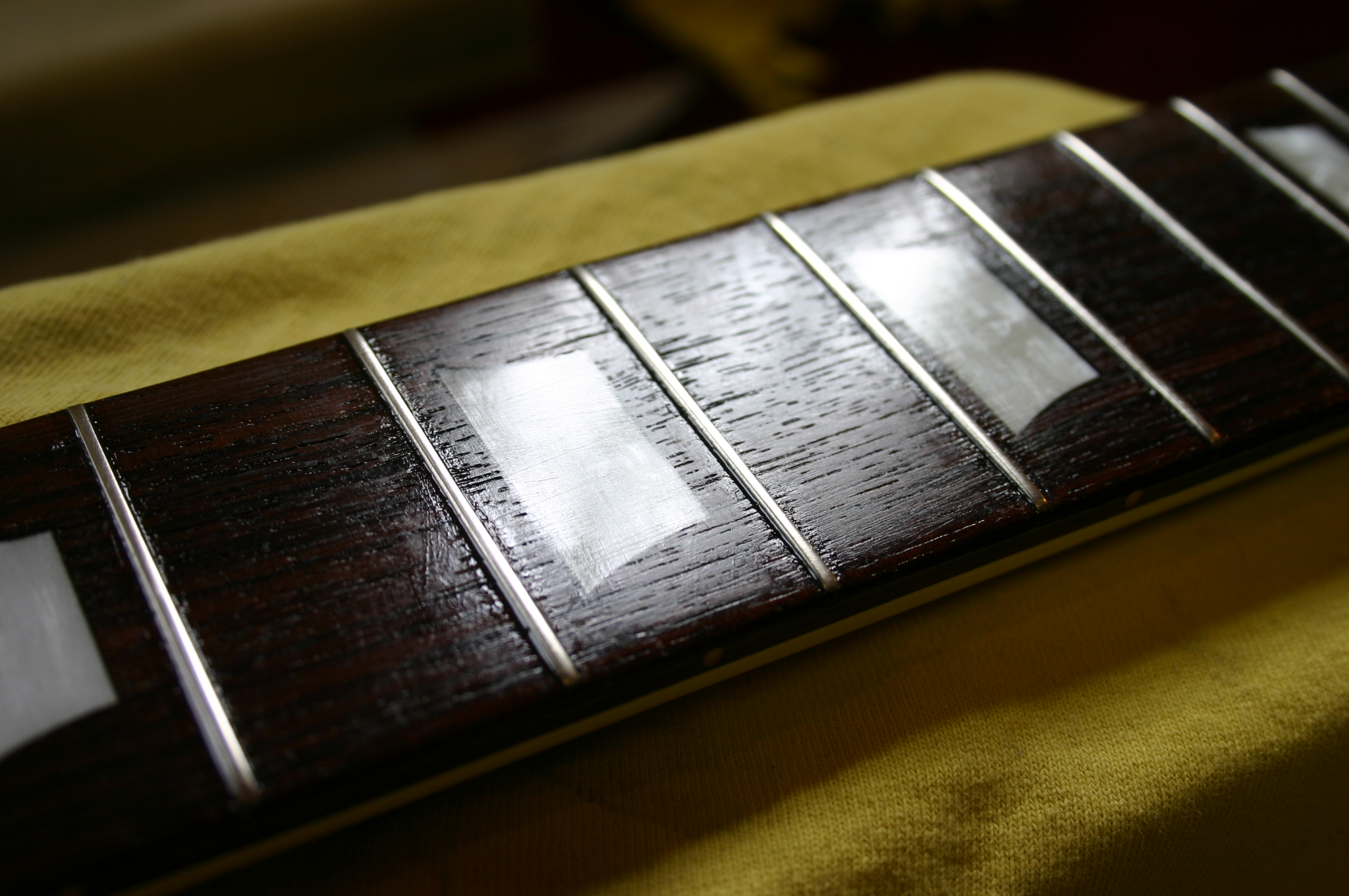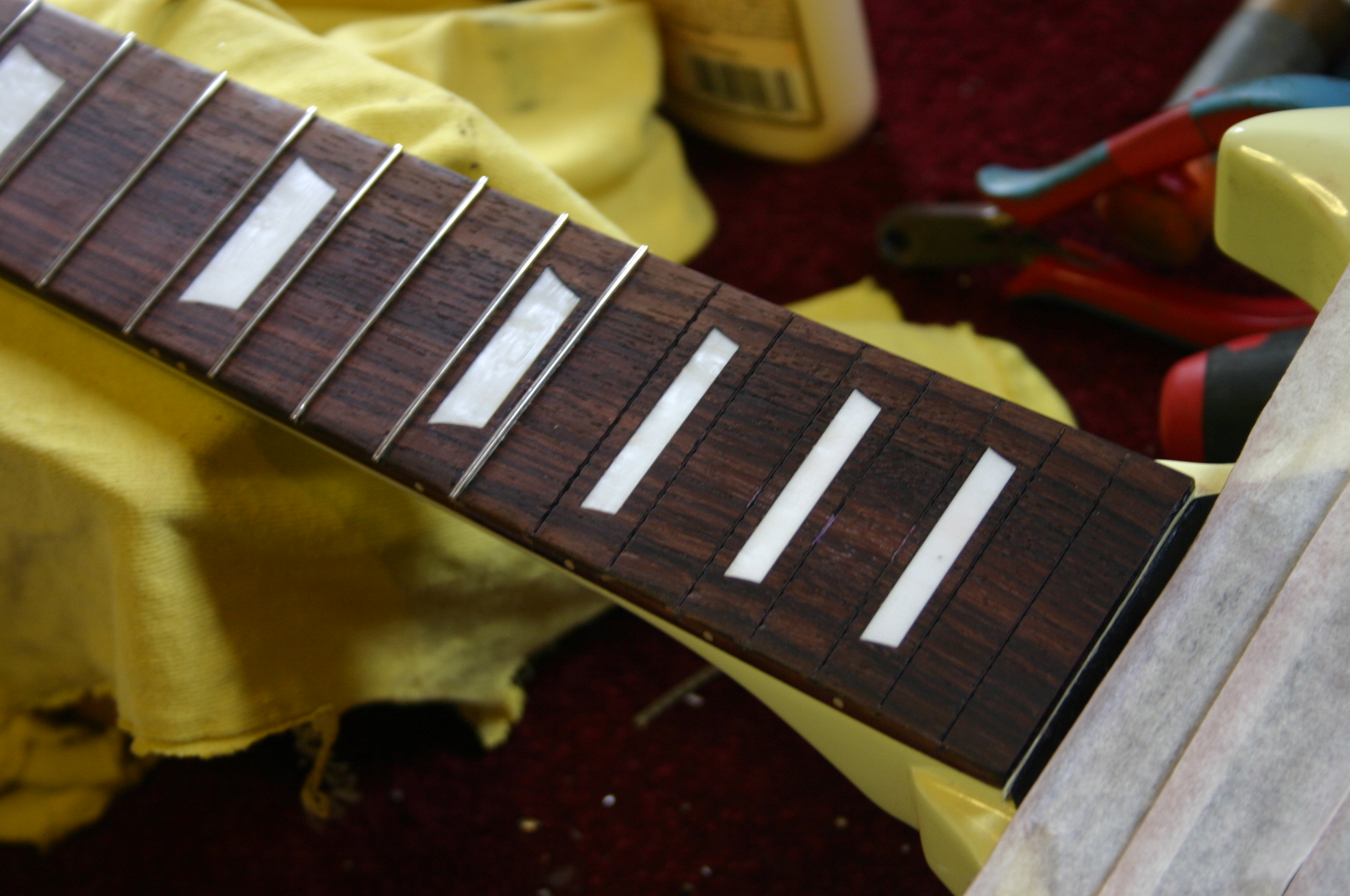 This was for a gentleman who has difficulty playing his guitar after an accident. He has limited movement in his right hand and finds it very difficult to play bar chords. The fingerboard was sanded flat removing the 12″ radius and the action brought down to 0.4mm at the 12th fret. The new frets are vintage size mandolin wire and the guitar is set-up with 8-36 gauge strings.