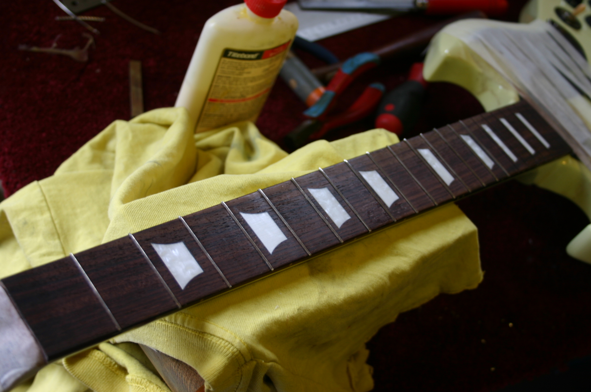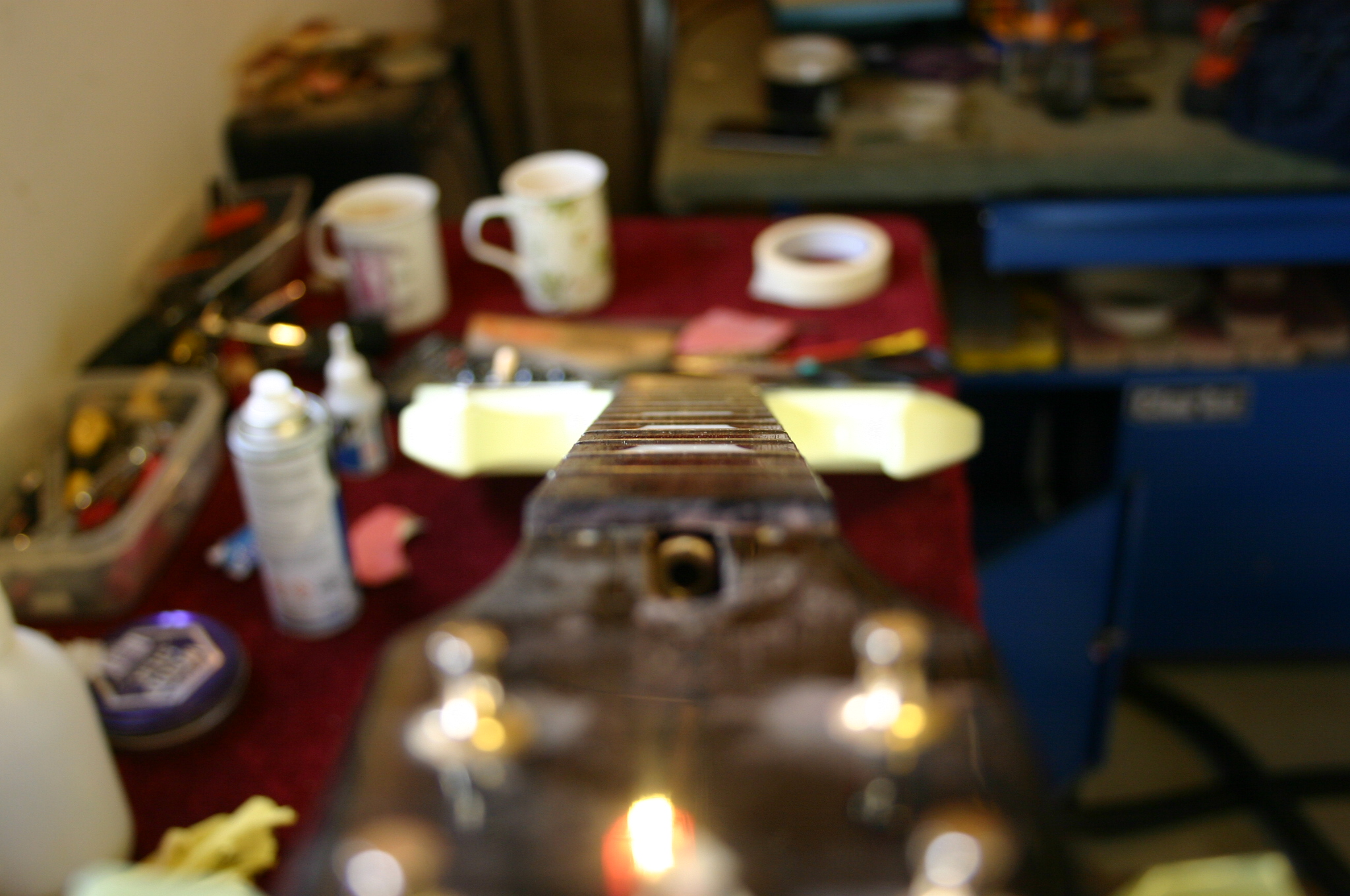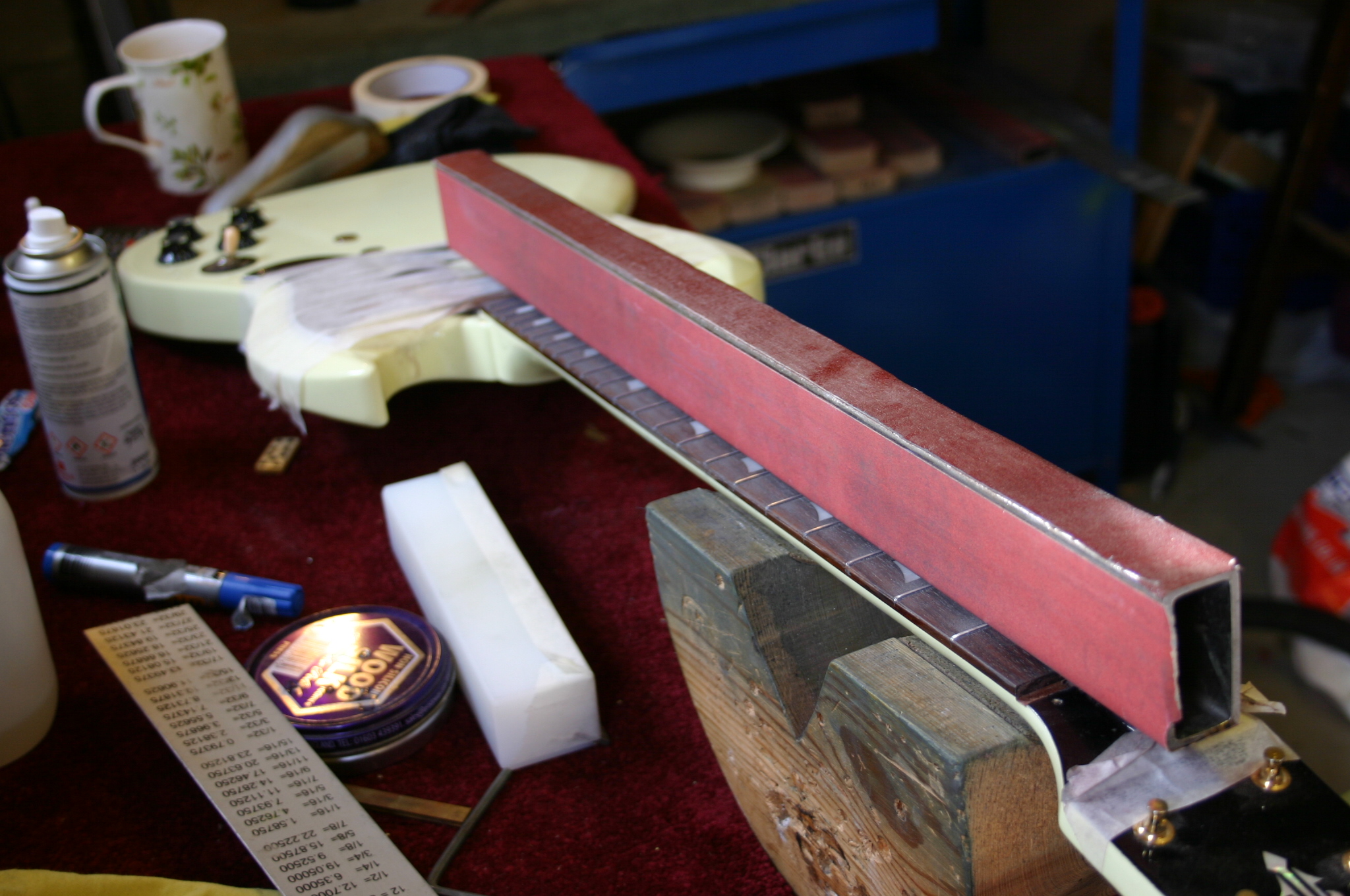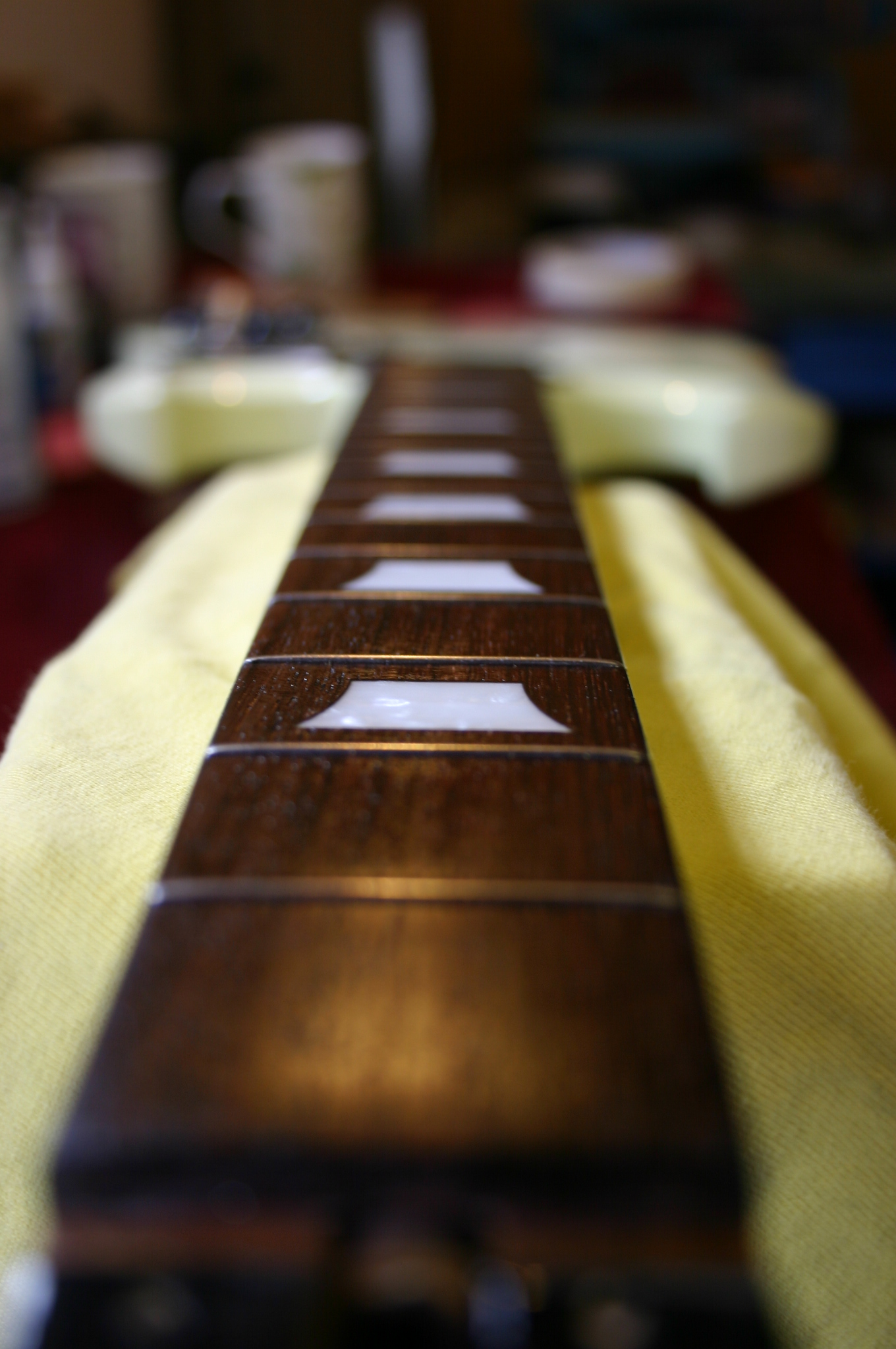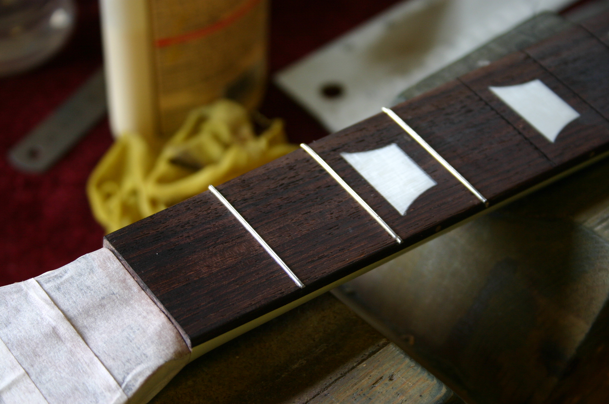 This was for a gentleman who has difficulty playing his guitar after an accident. He has limited movement in his right hand and finds it very difficult to play bar chords. The fingerboard was sanded flat removing the 12″ radius and the action brought down to 0.4mm at the 12th fret. The new frets are vintage size mandolin wire and the guitar is set-up with 8-36 gauge strings.
