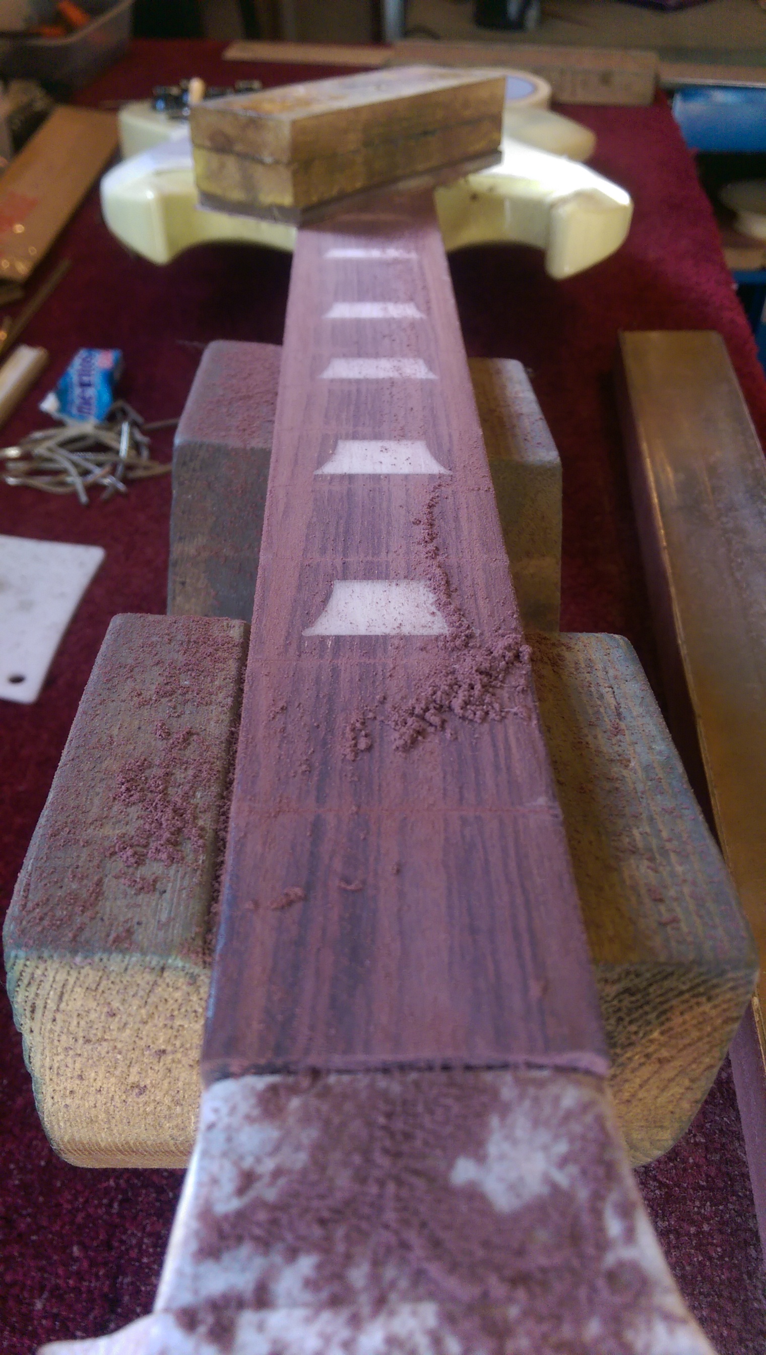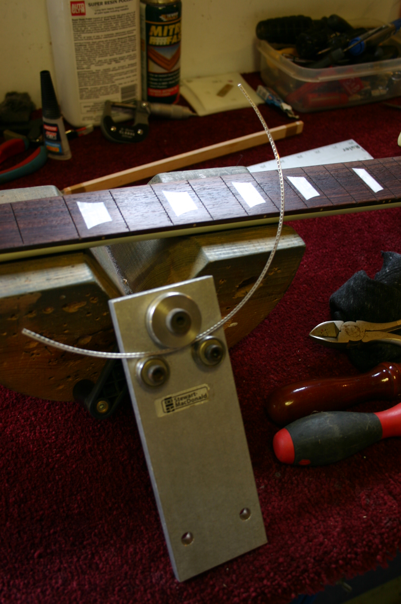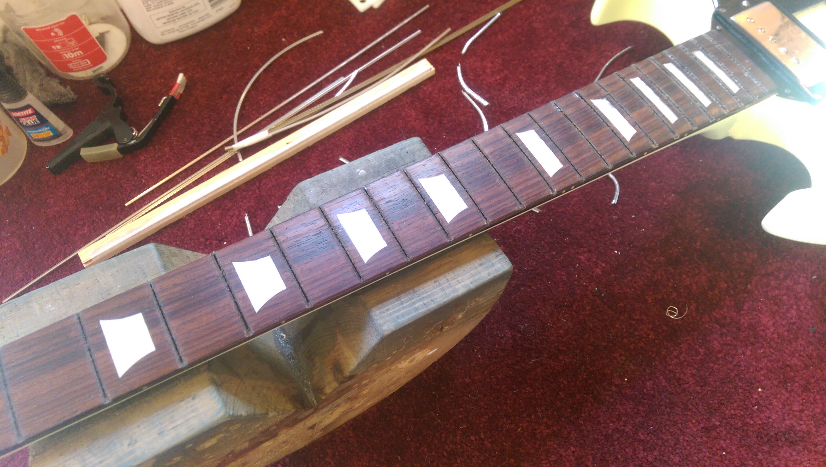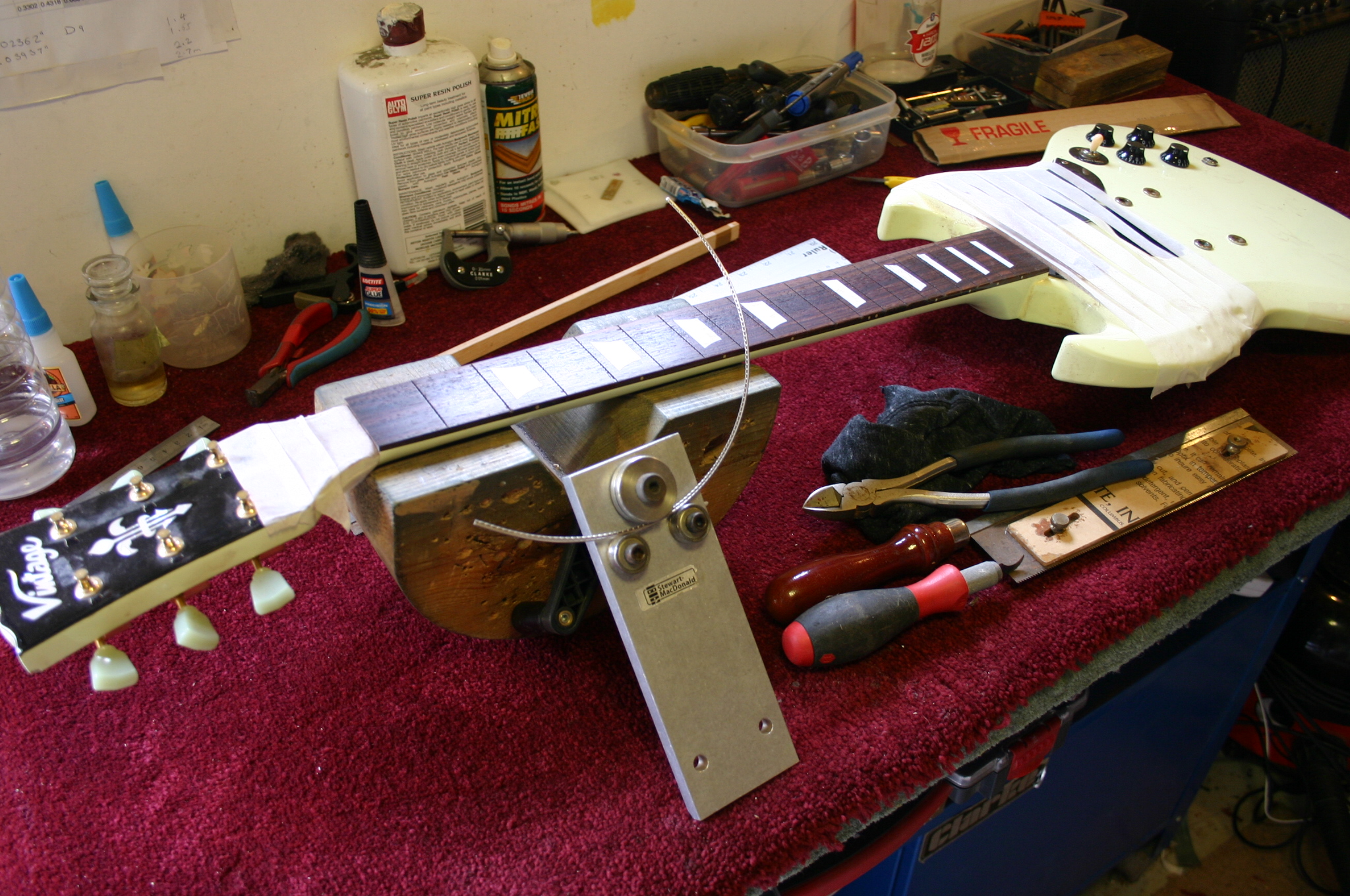 This was for a gentleman who has difficulty playing his guitar after an accident. He has limited movement in his right hand and finds it very difficult to play bar chords. The fingerboard was sanded flat removing the 12″ radius and the action brought down to 0.4mm at the 12th fret. The new frets are vintage size mandolin wire and the guitar is set-up with 8-36 gauge strings.