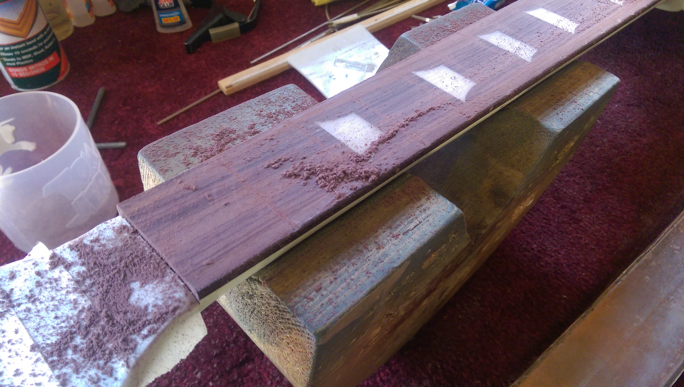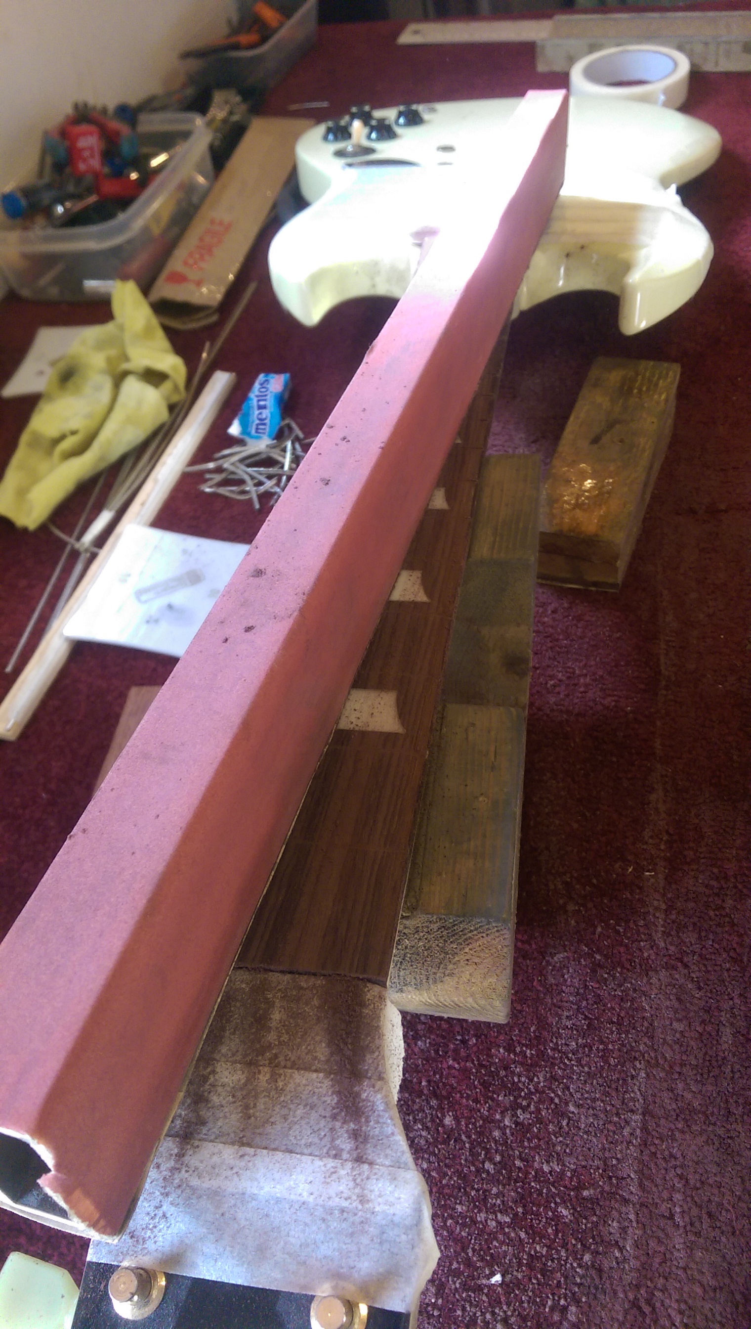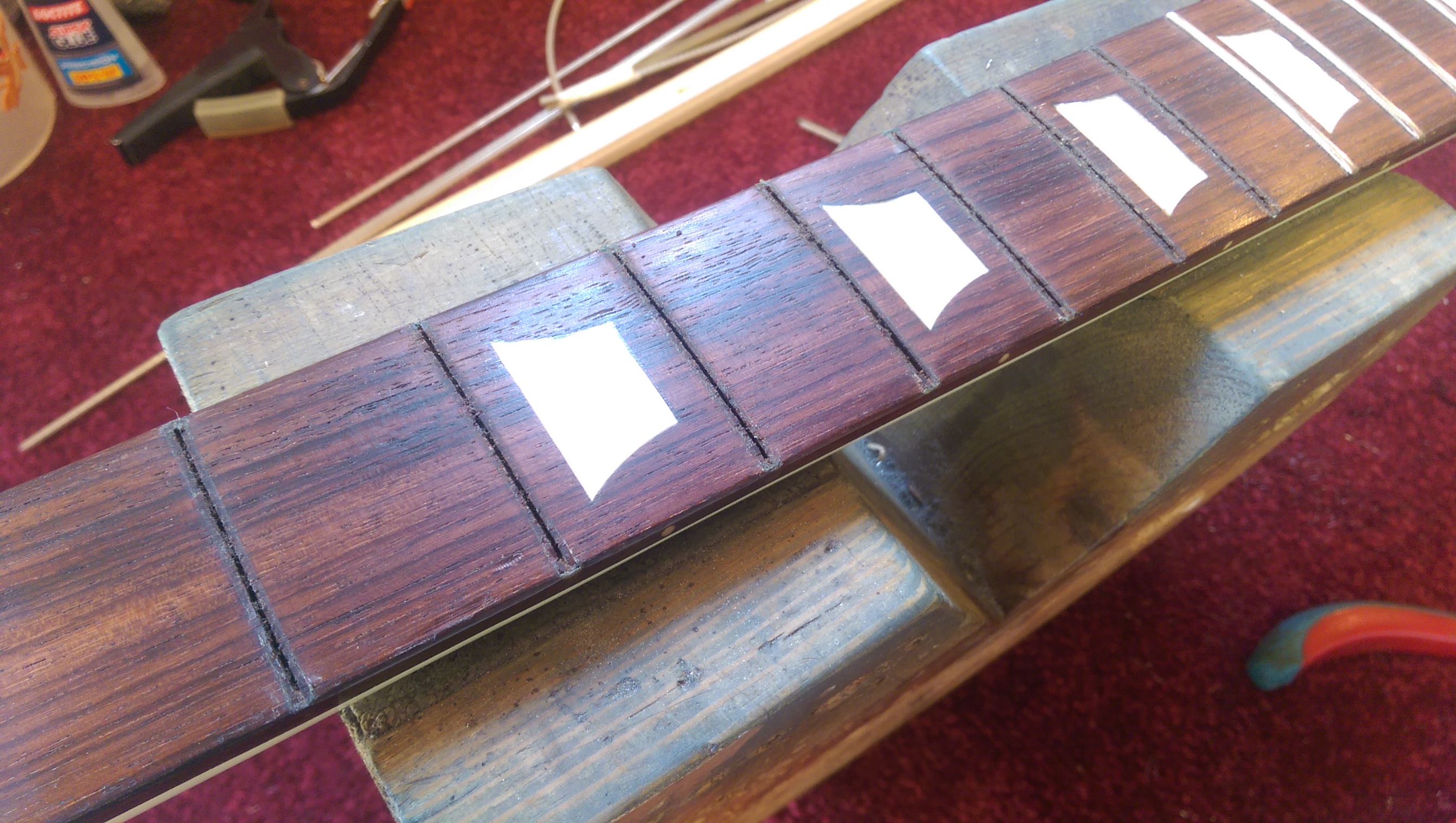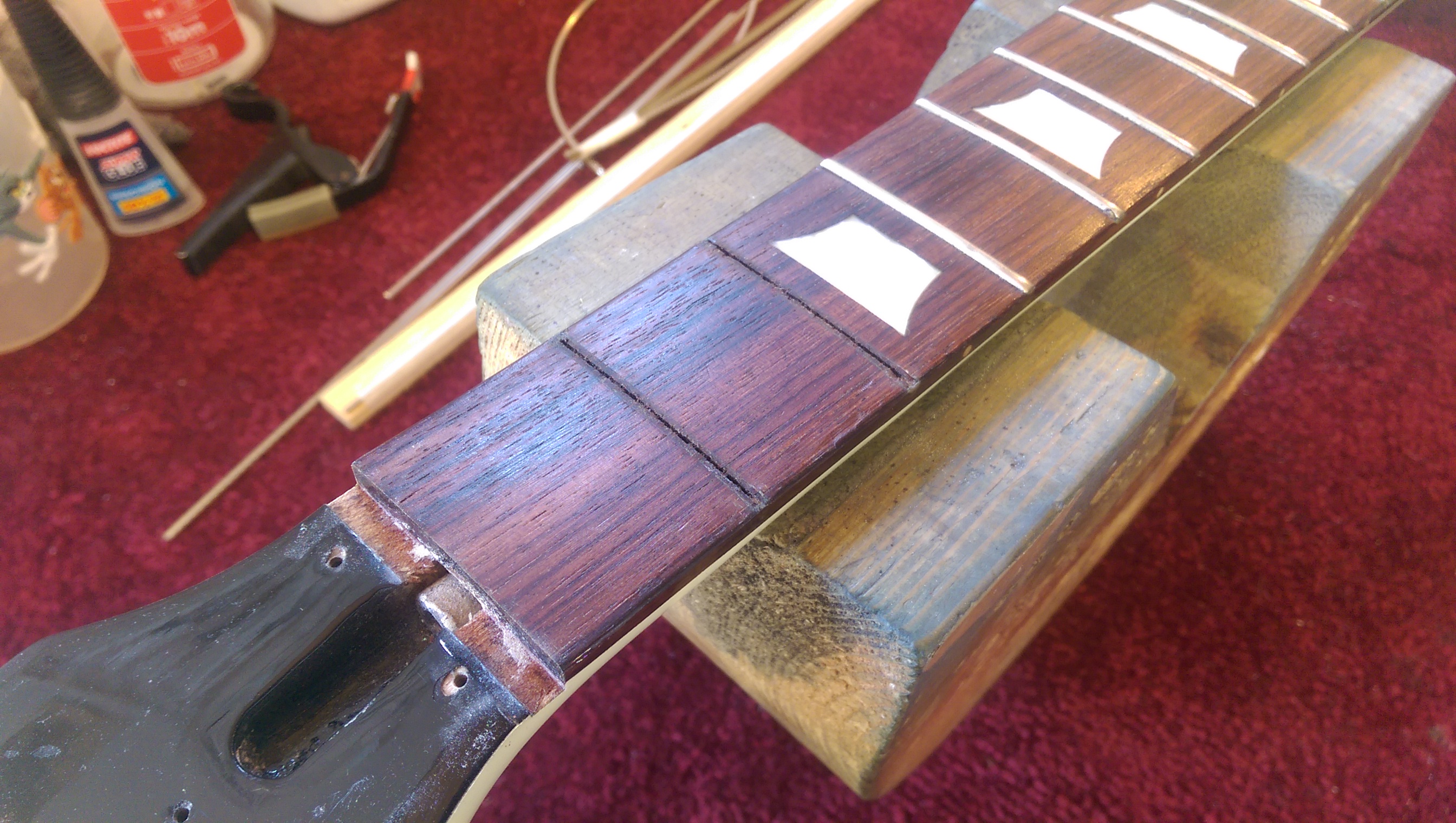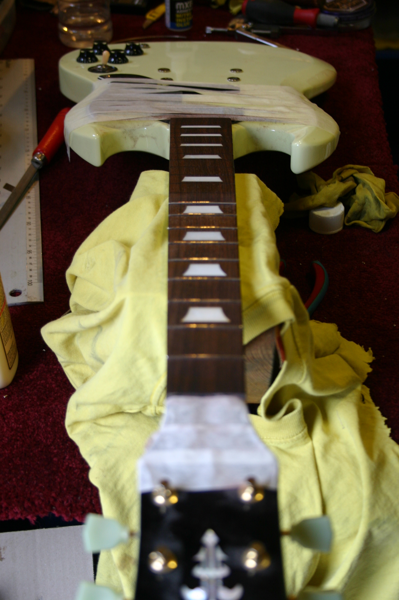 This was for a gentleman who has difficulty playing his guitar after an accident. He has limited movement in his right hand and finds it very difficult to play bar chords. The fingerboard was sanded flat removing the 12″ radius and the action brought down to 0.4mm at the 12th fret. The new frets are vintage size mandolin wire and the guitar is set-up with 8-36 gauge strings.