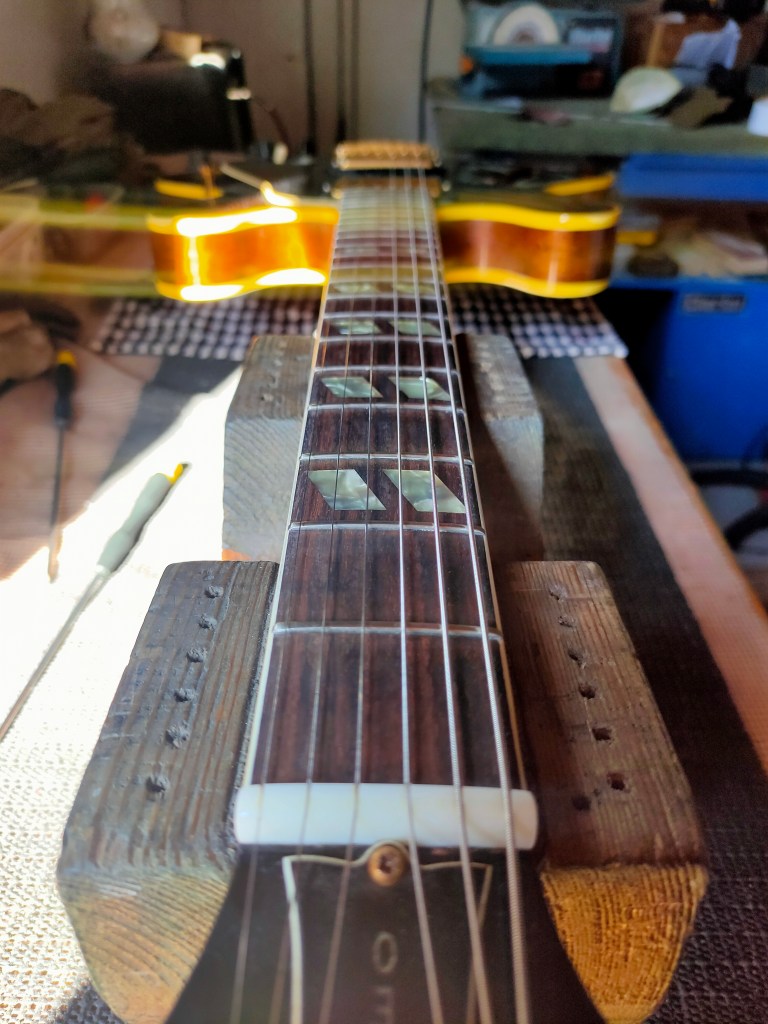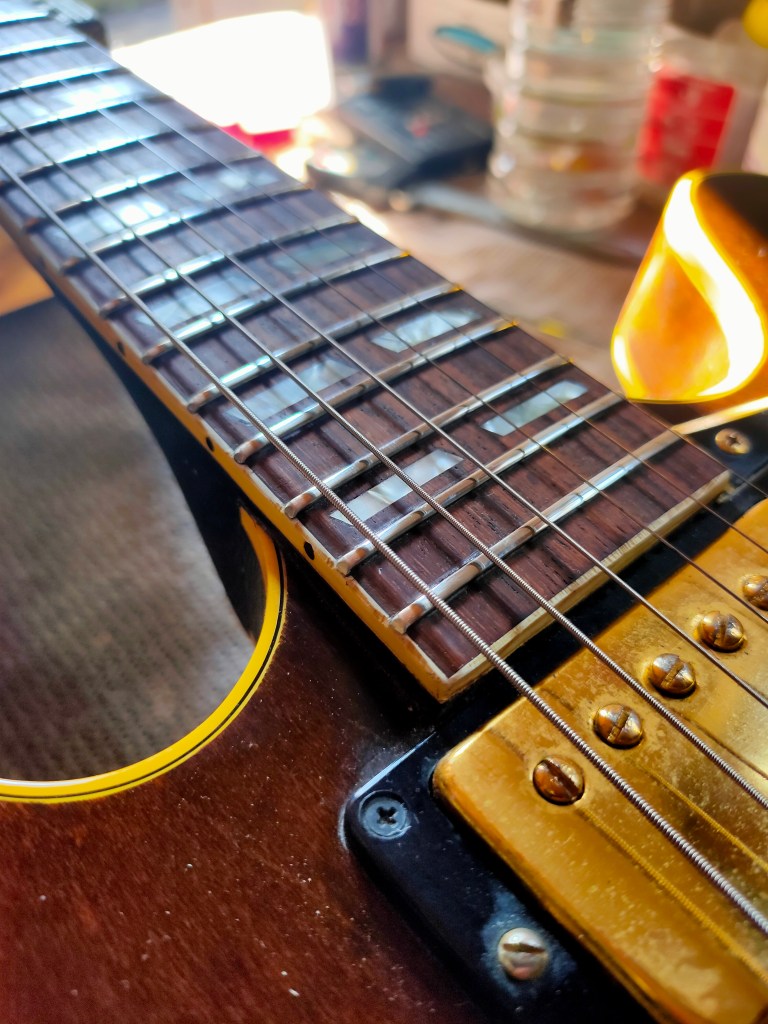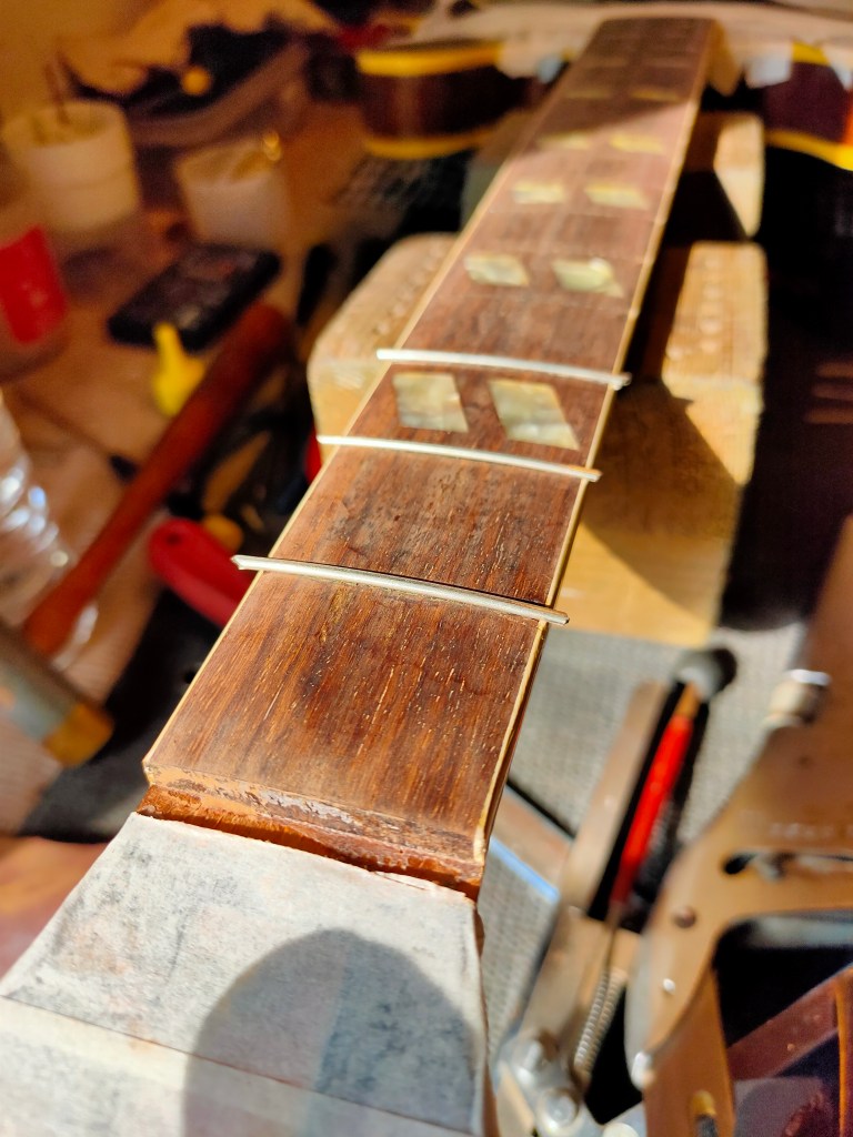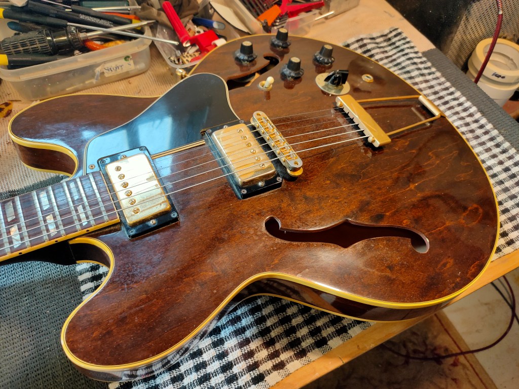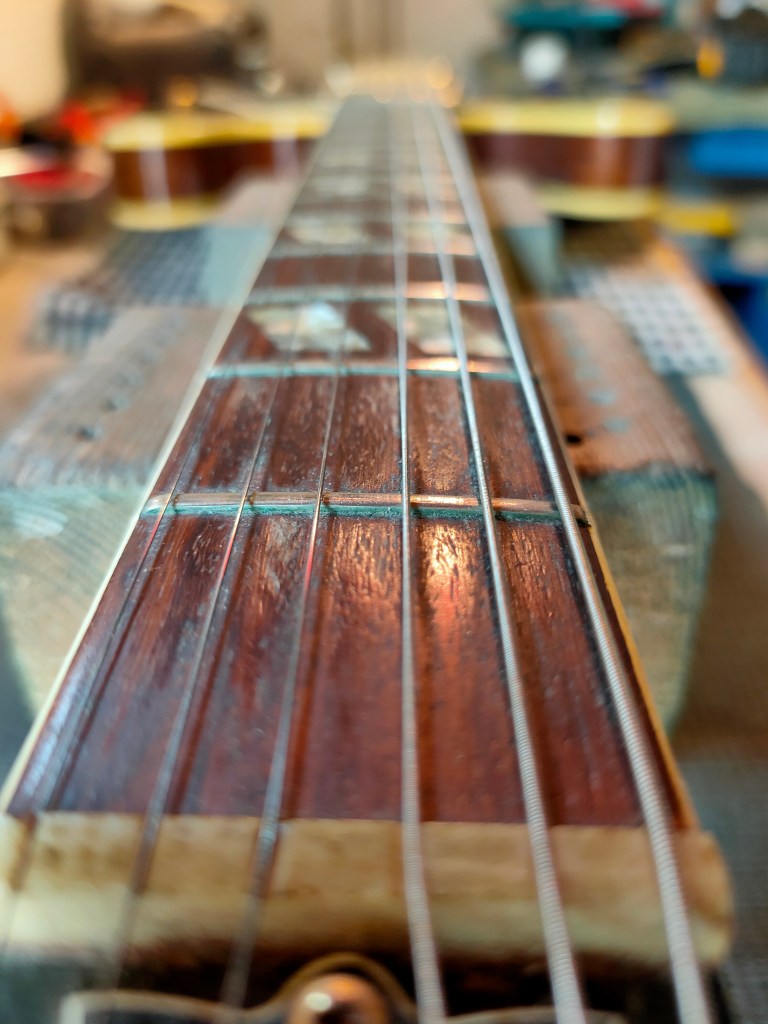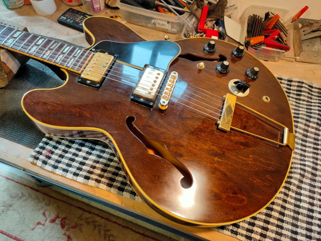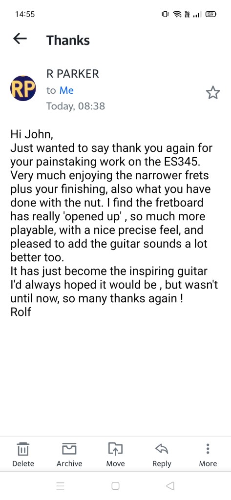 1970 Gibson ES345 re-fret with Dunlop 6260 Nickel/Silver Frets April 22, 2022 · by wesleyguitars · Bookmark the permalink. · 1970 Gibson ES345 in for a re-fret with Dunlop 6260 nickel/silver frets and a new bespoke camel bone nut. Click to share on X (Opens in new window) X Click to share on Facebook (Opens in new window) Facebook Like Loading... Related
