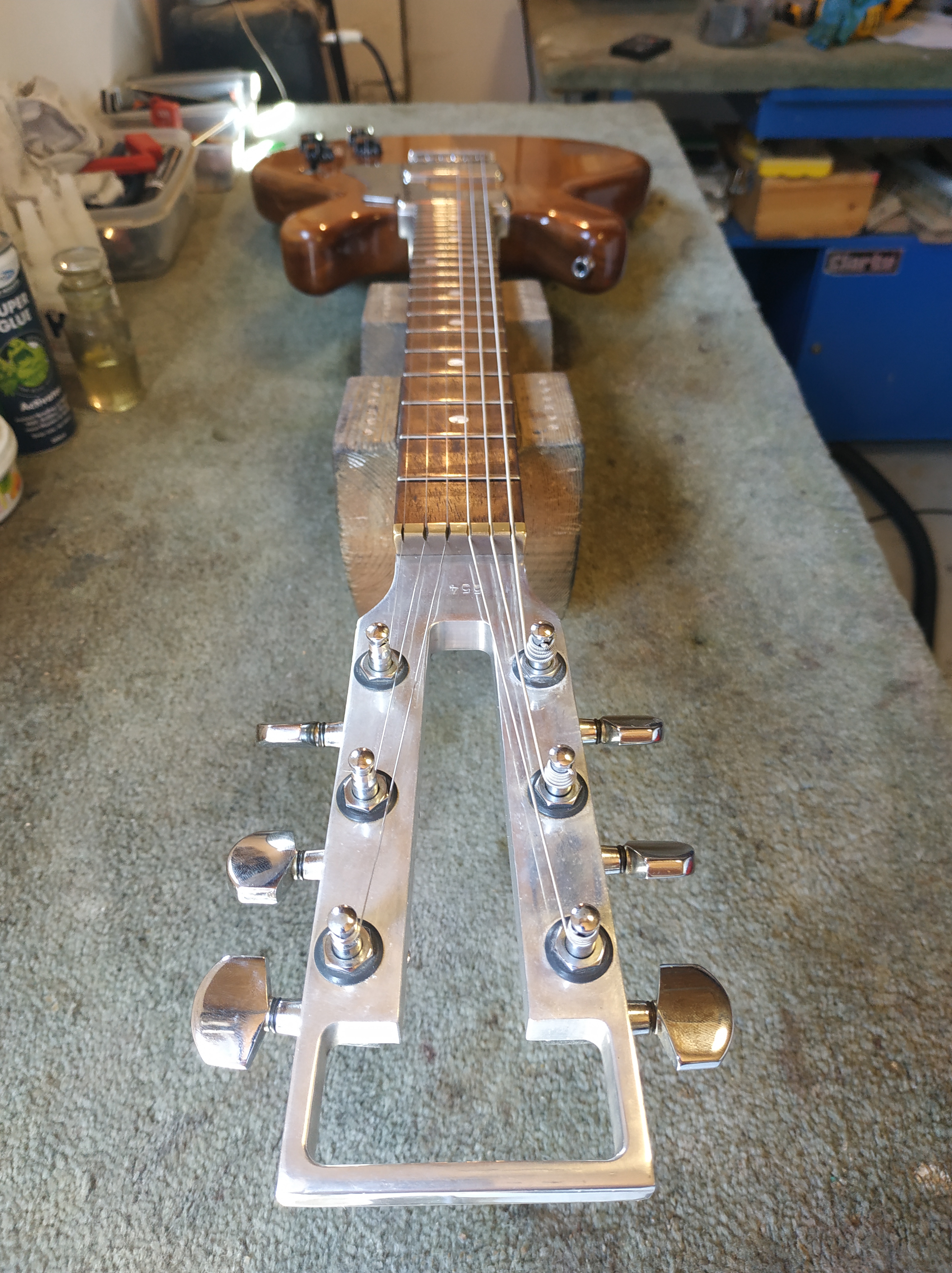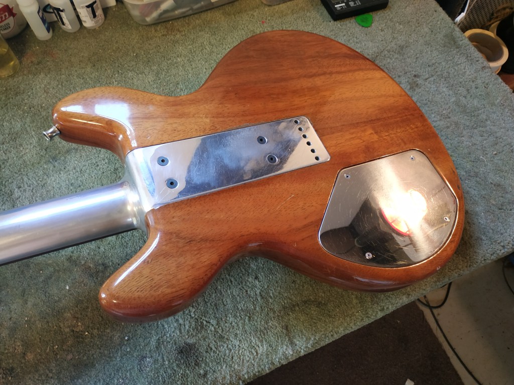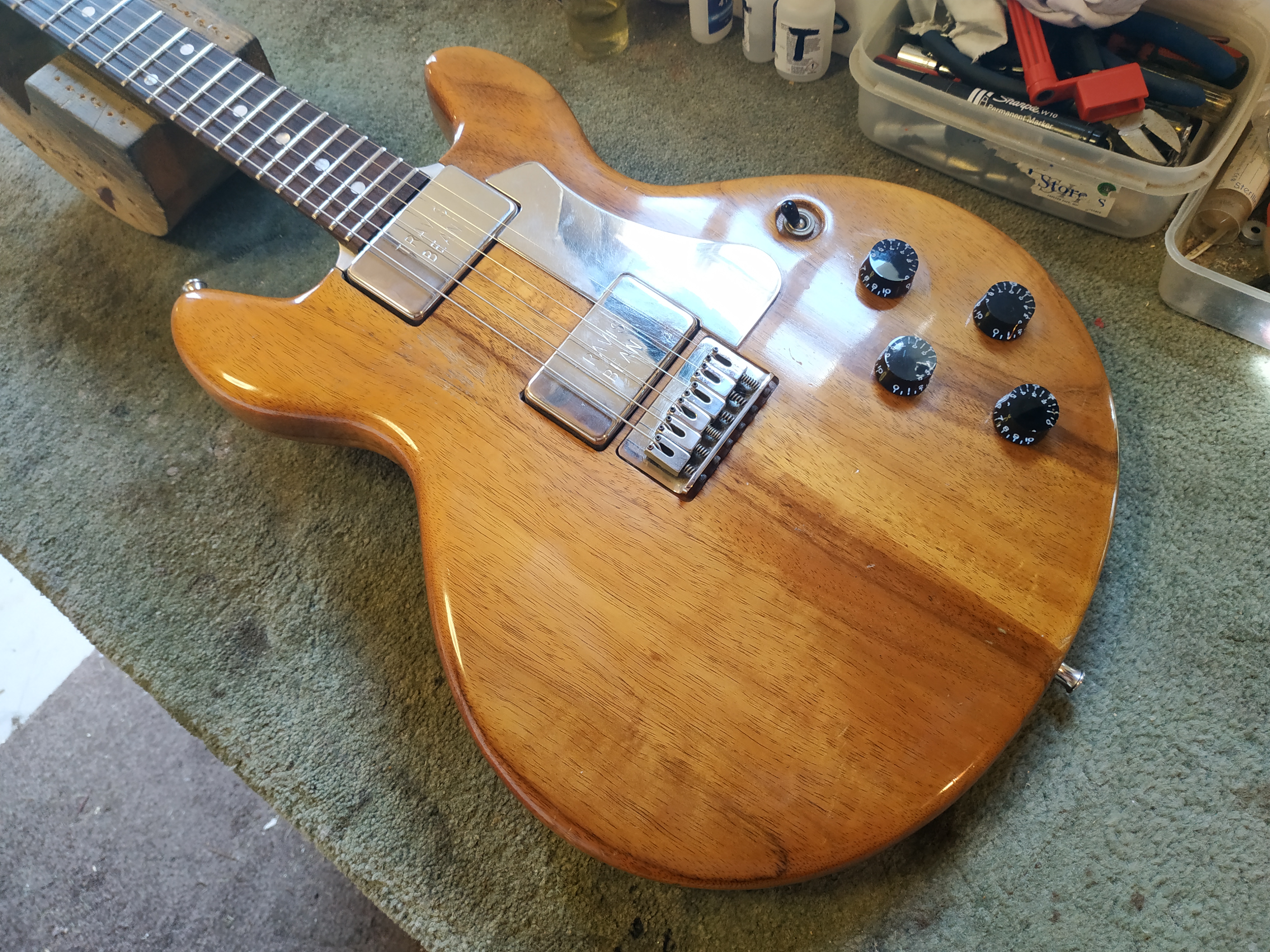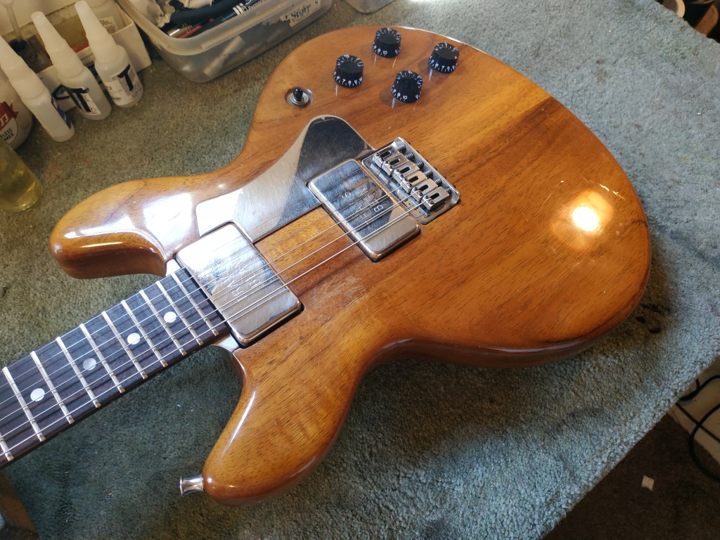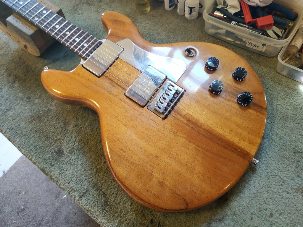 From California, a 1975 Travis Bean TB1000S. Machined aluminium neck with no trussrod. Solid koa body. A super heavy electric guitar with seemingly infinite sustain.