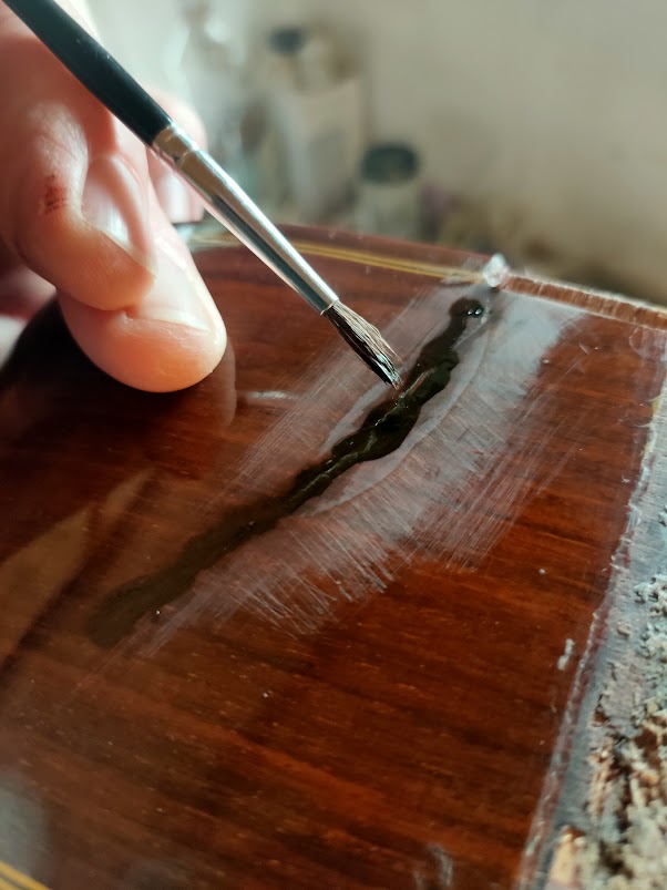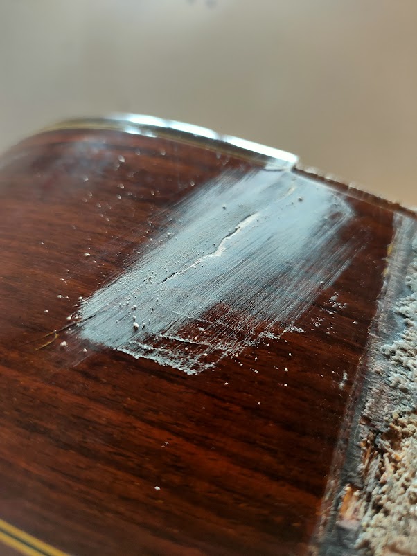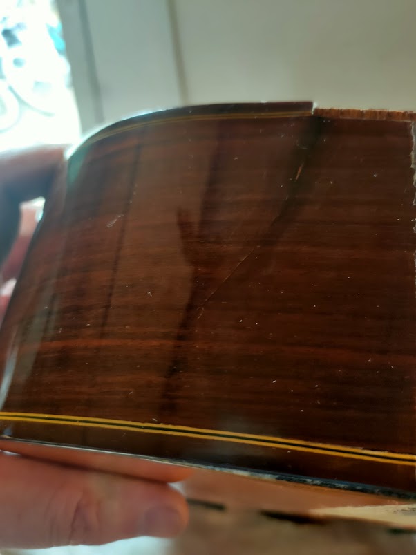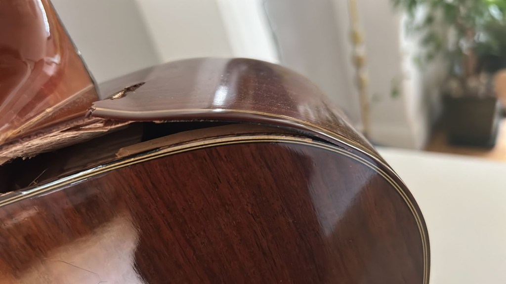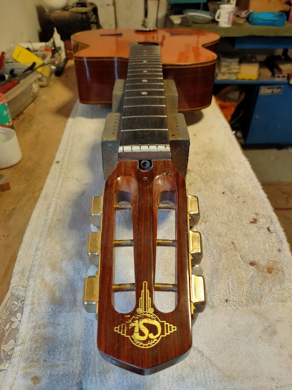 Pretty challenging repair this one! A CSL gypsy jazz acoustic belonging to the owner’s late father. Neck had been stamped on breaking the dovetail and block in half. After removing the fingerboard extension, the neck was removed using the heat from some foam needle cutters. The neck was then Converted to a Taylor style bolt-on.
